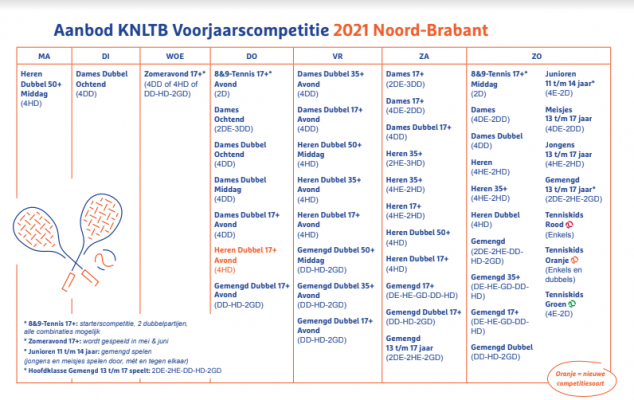 Hieronder zien jullie alle speelmogelijkheden die we aanbieden. Ze zijn als ‘vanouds’, dat wil zeggen de avondcompetities zijn regulier (niet spelen op tijd). Nieuw in het aanbod is de mogelijkheid van heren dubbel op donderdagvond. Zie ook https://www.tvbavel.nl/userfiles/vjcompetitie/52_20191028_weekplanner_2020_noord_brabant.pdf