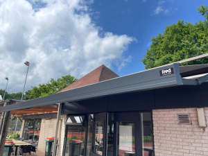 Vanaf deze week genieten we van een prachtig nieuw zonnescherm op ons terras – ideaal voor een verkoelend drankje na een potje tennis. 🥤🎾
